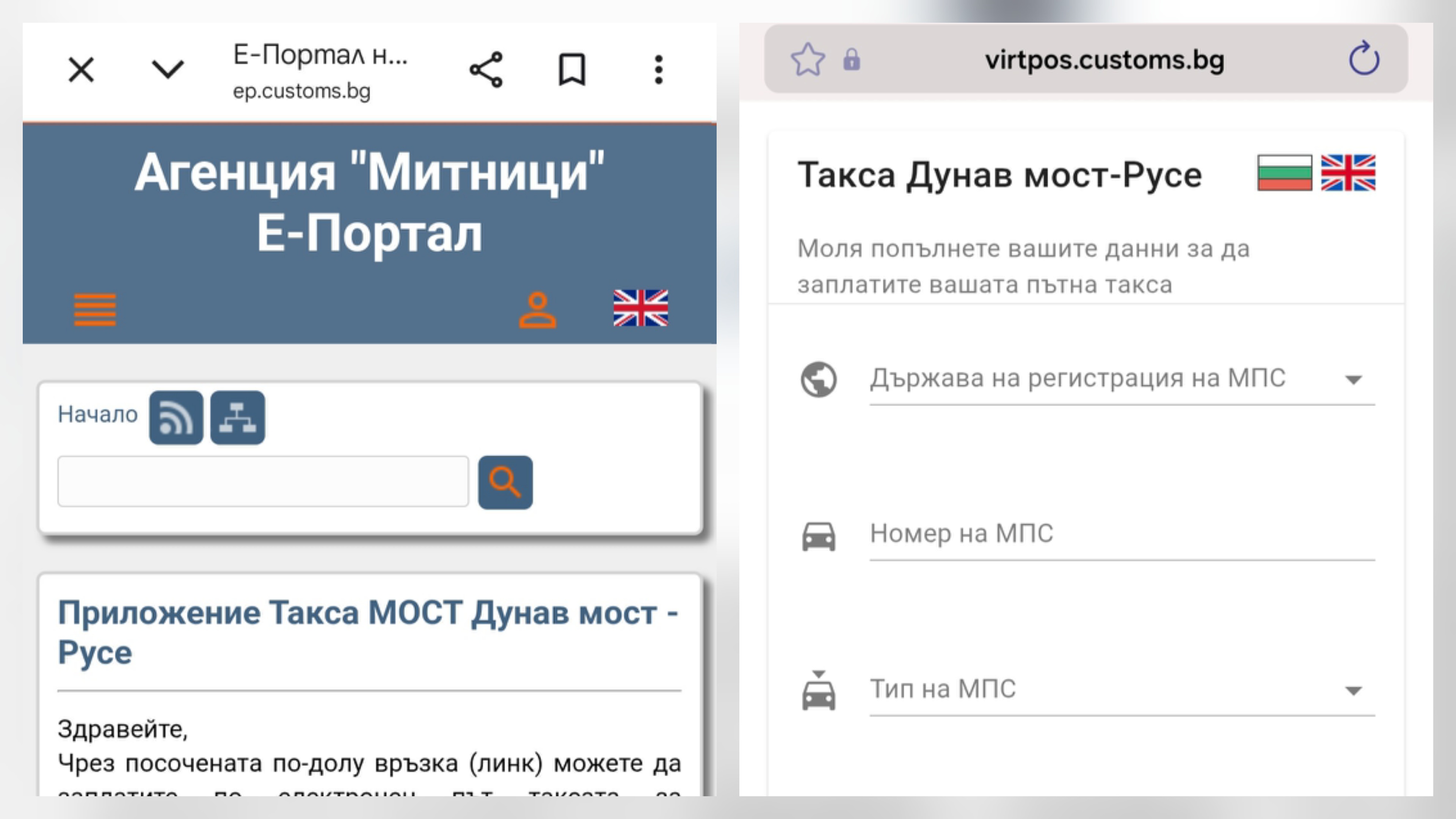 Във връзка със случай на оплакване от гражданин, платил такса „мост“ за Дунав мост – Русе към нелегитимен сайт, Агенция „Митници“ припомня, че възможността за онлайн плащане на такса за преминаване на Дунав мост в посока Русе – Гюргево е достъпна само и единствено на Е-Портала на Агенция „Митници“ на адрес: https://ep.customs.bg/eportal/public/index?pageId=41&isActive=id6 и на директен линк към виртуален ПОС-терминал https://virtpos.customs.bg/vpos