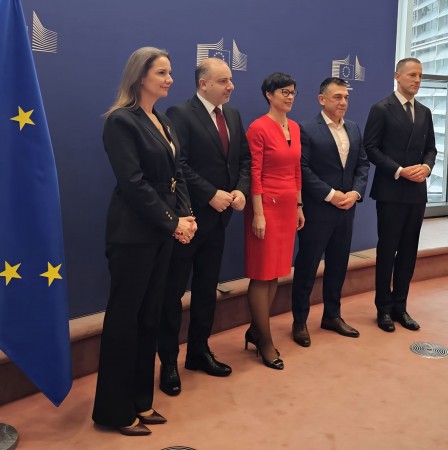 Европейският комисар по разширяването Марта Кос, с ръководителите на двете митнически администрации - Бобан Николовски и Георги Димов. Снимка: Агенция "Митници"