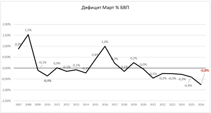 Дефицитът за месец март с натрупване е в размер на -1,5 млрд. евро и представлява -1,2% от БВП – най-високата стойност за последните 15 години (от 2010 г. насам).