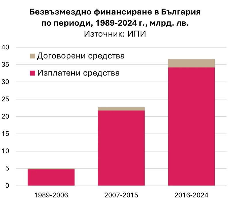Общият обем на полученото безвъзмездно финансиране в България от началото на прехода до 2024 г. е близо 70 млрд. лева.