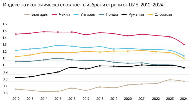 В актуалното издание (основано на данни за 2024 г.) България е на 33-о място с ECI оценка 0,8 — горната третина в световен мащаб. Преди десетилетие страната се движела около 40-45-во място, така че имаме всички основания да заключим, че налице е реален напредък. Това обаче се случва относително бавно, особено на фона на останалите страни със сходна икономическа траектория. В последното издание на индекса Чехия е на 7-мо място, Унгария — на 13-о, Словакия — на 17-о, Румъния — на 23-то. Всичките тези държави имат подобна отправна точка, но ключови разлики: Чехия и Унгария са привлекли огромни инвестиции в автомобилостроене и електроника; Словакия е изградила един от най-наситените автомобилни производства на глава от населението в света. Румъния, която преди десетилетие беше зад България, днес изпреварва с близо 10 позиции.