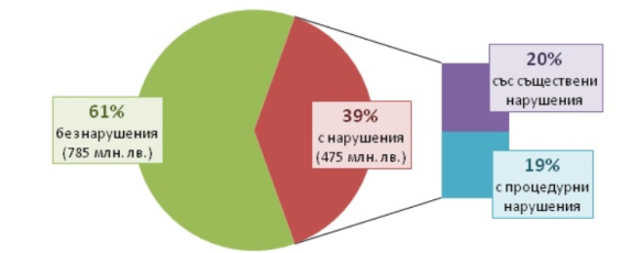 От 445 поръчки с нарушения около половината или 229 (20% от проверените) са със съществени нарушения, а другата половина, 216 (19% от проверените) – с процедурни. Именно първата група ясно показва дълбоко вкоренения порок на системата за обществени поръчки – неспазване на свободната конкуренция, равнопоставеността, публичността и прозрачността на процеса. Те са на стойност от 164 млн. лв. и включват: