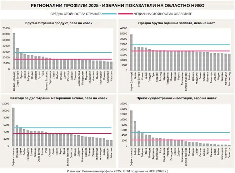 В тазгодишното издание изследването на ИПИ „Регионални профили: показатели за развитие“ 2025 столицата отново се откроява като безспорен лидер в повечето категории на икономическото развитие на областите. Съсредоточаването на инвестиции (вътрешни и външни), високи заплати и нови компании води до това, че при някои индикатори София е единствената област с над средната за страната стойност. По този начин често традиционно силните области, обикновено също със силни сектори на услугите и индустрията, не могат изпъкнат в общата статистика.