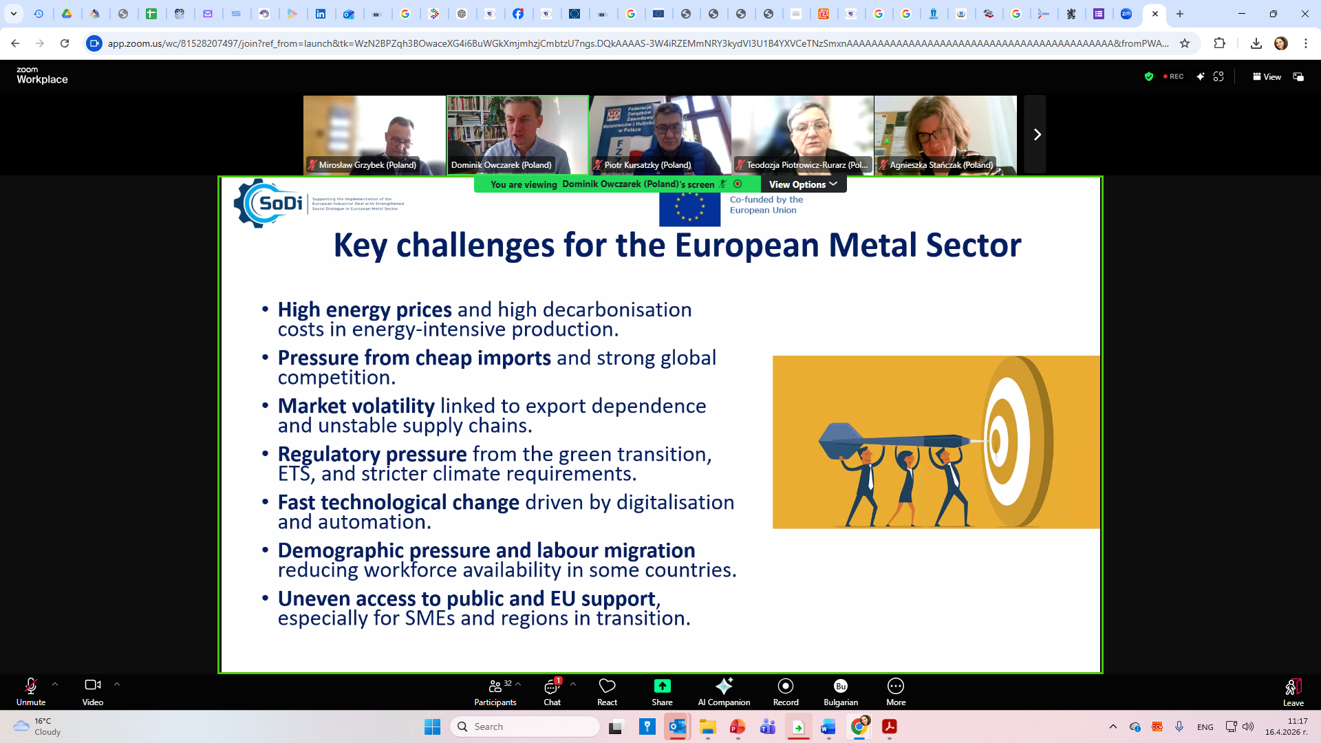 Доминик Овчарек от Федерацията на профсъюзите на металурзите и работниците в металния сектор в Полша представи ключовите предизвикателства за металния сектор в Европа, сред които са: