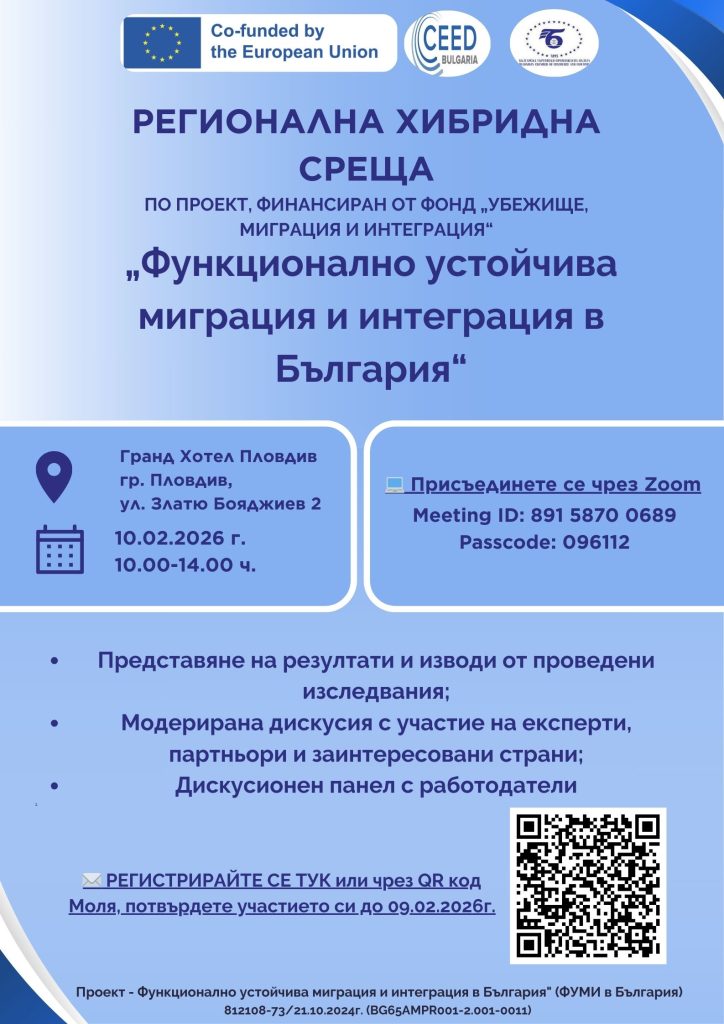Българската търговско-промишлена палата и Центърът за предприемачество и управленско развитие /CEED България/ организират регионална хибридна среща по проект "Функционално Устойчива Миграция и Интеграция в България" (ФУМИ в България), която ще се проведе на 10 февруари /вторник/ от 10.00 ч. в Гранд хотел Пловдив /ул. „Златю Бояджиев“ 2, Бизнес зала 1/ и онлайн в платформата Zoom.
