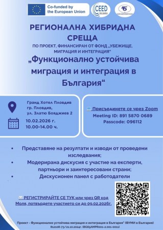 Българската търговско-промишлена палата и Центърът за предприемачество и управленско развитие /CEED България/ организират регионална хибридна среща по проект "Функционално Устойчива Миграция и Интеграция в България" (ФУМИ в България), която ще се проведе на 10 февруари /вторник/ от 10.00 ч. в Гранд хотел Пловдив /ул. „Златю Бояджиев“ 2, Бизнес зала 1/ и онлайн в платформата Zoom.