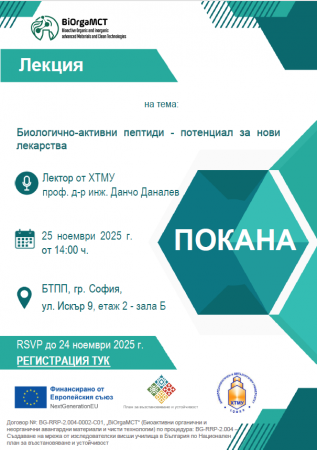 Българската търговско-промишлена палата и Химикотехнологичният и металургичен университет (ХТМУ) имат удоволствието да Ви поканят на бизнес дискусия на тема „Биологично-активни пептиди - потенциал за нови лекарства“.