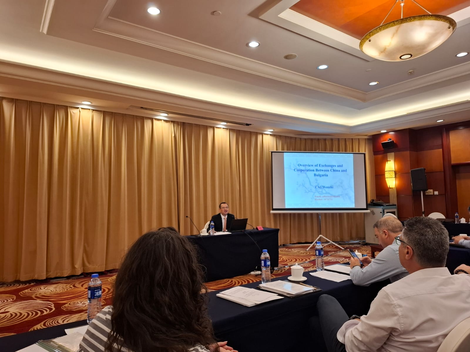Лекционната част започна с представяне на отношенията между България и Китай през годините от Цай Венжи. Той наблегна на факта, че обменът и дипломатическите отношения между двете страни датира още от 1949г., което прави България втората страна в света, осъществила дипломатически отношения с Китайската народна република. Цай Венжи сподели, че отношенията между България и Китай са стабилни и имат значителен потенциал за развитие, особено в икономическа, технологична и аграрна насока. Той информира, че през 1952 г. правителствата на България и Китай подписват първото търговско споразумение. Лекторът направи обзор на търговско-икономическите отношения, поставили началото си през 80-те години на миналия век, надградени и развити през годините с подписани редица споразумения – за насърчаване на инвестициите, избягване на двойното данъчно облагане, икономическото сътрудничество в енергетиката, туризма, науката и образованието.