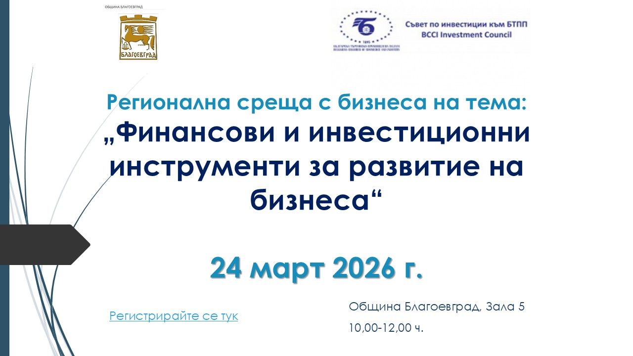 Съветът по инвестиции към Българската търговско-промишлена палата (БТПП) и Община Благоевград отправят покана към представители на бизнеса за участие в регионална среща в гр. Благоевград на тема: „Финансови и инвестиционни инструменти за развитие на бизнеса“. Събитието ще се състои на 24 март 2026 г. /вторник/ от 09:30 до 12:00 ч. в Община Благоевград, Зала 5.