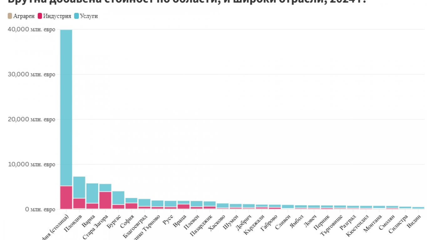 През 2024 г. София продължава да се откъсва все по-ясно в икономическото си развитие от останалите региони, като БВП на човек от населението достига 35,4 хил. евро. Заради големия дял на столичната икономика единствено Стара Загора надхвърля средното за страната равнище на БВП с 22,4 хил. евро на човек. Следват Варна и Враца с по 15,2 хил. евро на човек, а в първата петица влиза и Пловдив с 13,1 хил. евро. В края на класацията има ново разместване: Сливен излиза на последно място с 6,7 хил. евро на човек, а под 8 хил. евро остават още Силистра, Хасково и Монтана. Разликите между тези области обаче са минимални, което прави бъдещи промени в подреждането напълно вероятни. Прави впечатление, че половината области се разполагат в границите между 9 и 12 хил. евро БВП на човек, което от своя страна означава, че в значителна част от страната няма големи разлики. Разпределението на добавената стойност потвърждава извода, че сред икономически силните области услугите заемат все по-голям дял, а там, където земеделието играе по-значима роля степента на развитие е ниска.