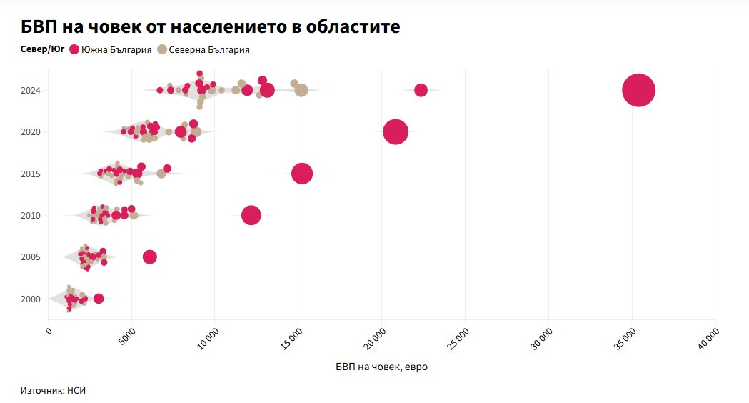 На сходен извод навежда и динамиката в икономическата тежест на областите в национален мащаб. През 2024 г. тя е силно концентрирана: София формира 44% от БВП на България (46 млрд. евро), Пловдив – 8% (8,3 млрд. евро), Варна и Стара Загора – по 6%, а Бургас – 4%. В същото време девет области, основно в Северна България, допринасят под 1% от общия БВП. За сравнение, през 2000 г. делът на столицата е бил 26%, а области с под 1% липсват. Важно е да отбележим, че дяловете на вторичните ядра не се променят особено – Пловдив нараства от 7,4% на 8%, Варна остава без промяна на 6,3%, Стара Загора – от 5,3% на 6,2%. Нарастването на дела на столицата, с други думи, се случва за сметка на най-малките и слаборазвити региони икономики.