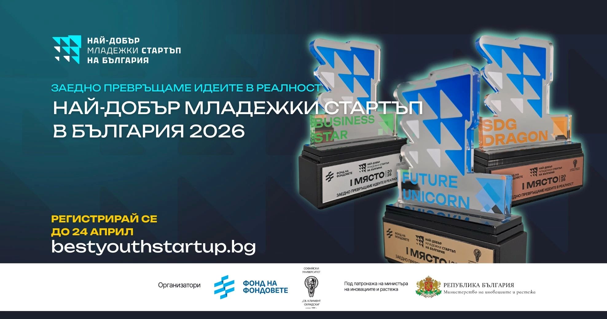 От 12 януари до 24 април 2026 г. младежи от цялата страна на възраст от 18 г. до 29 г. (вкл. студенти и ученици от 11 и 12 клас) с иновативни бизнес идеи, могат да се запишат за участие в петото издание на националния конкурс “Най-добър младежки стартъп в България”. Състезанието е най-мащабната инициатива за подкрепа на младежко предприемачество у нас и се организира от Фонд на фондовете и Стопанския факултет в СУ “Св.Климент Охридски” под патронажа на министъра на иновациите и растежа.