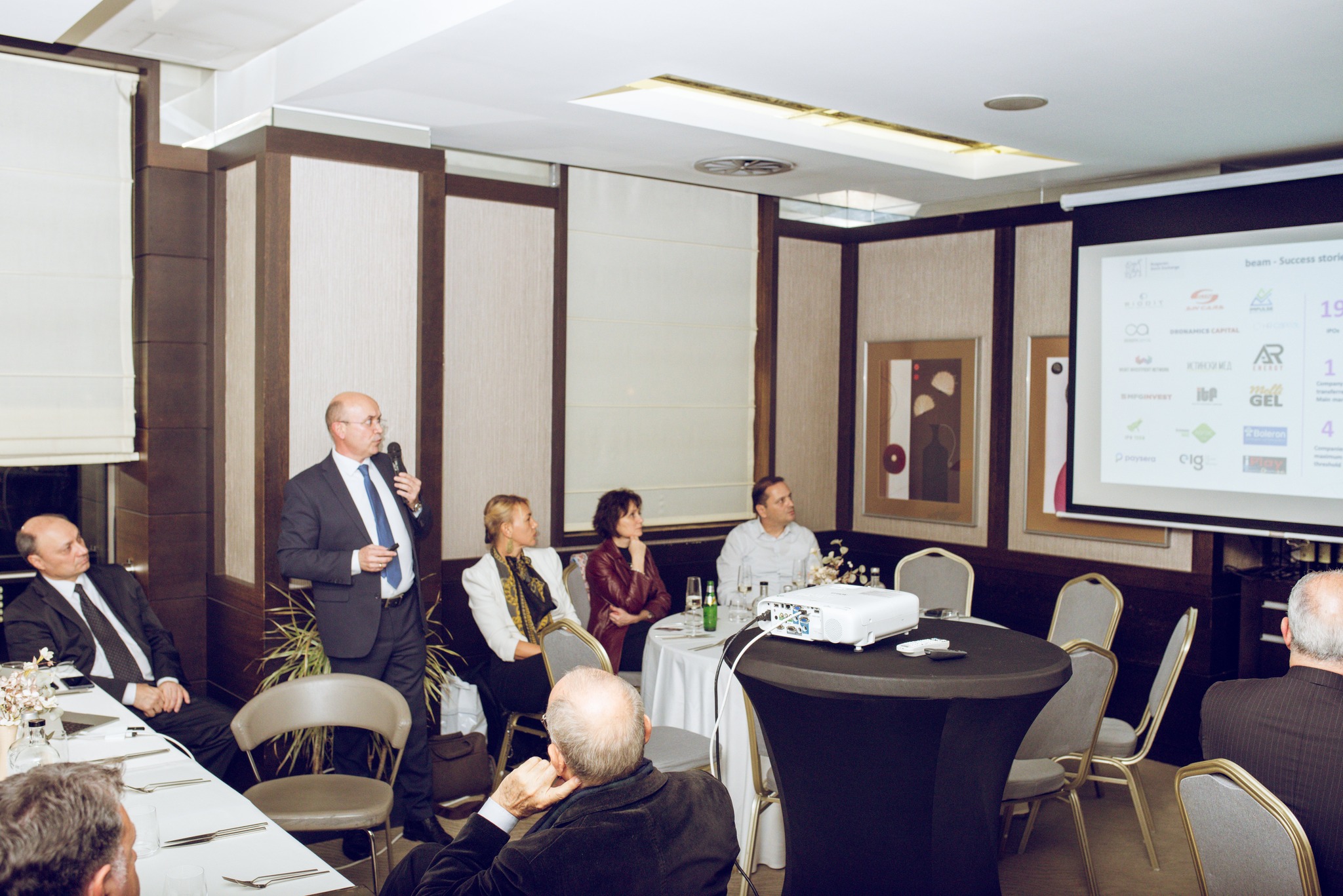 Проф. Маню Моравенов, главен изпълнителен директор на Българската фондова борса, изнесе презентации за EuroBridge и BEAM - две инициативи с голям потенциал за бизнес общността в България.