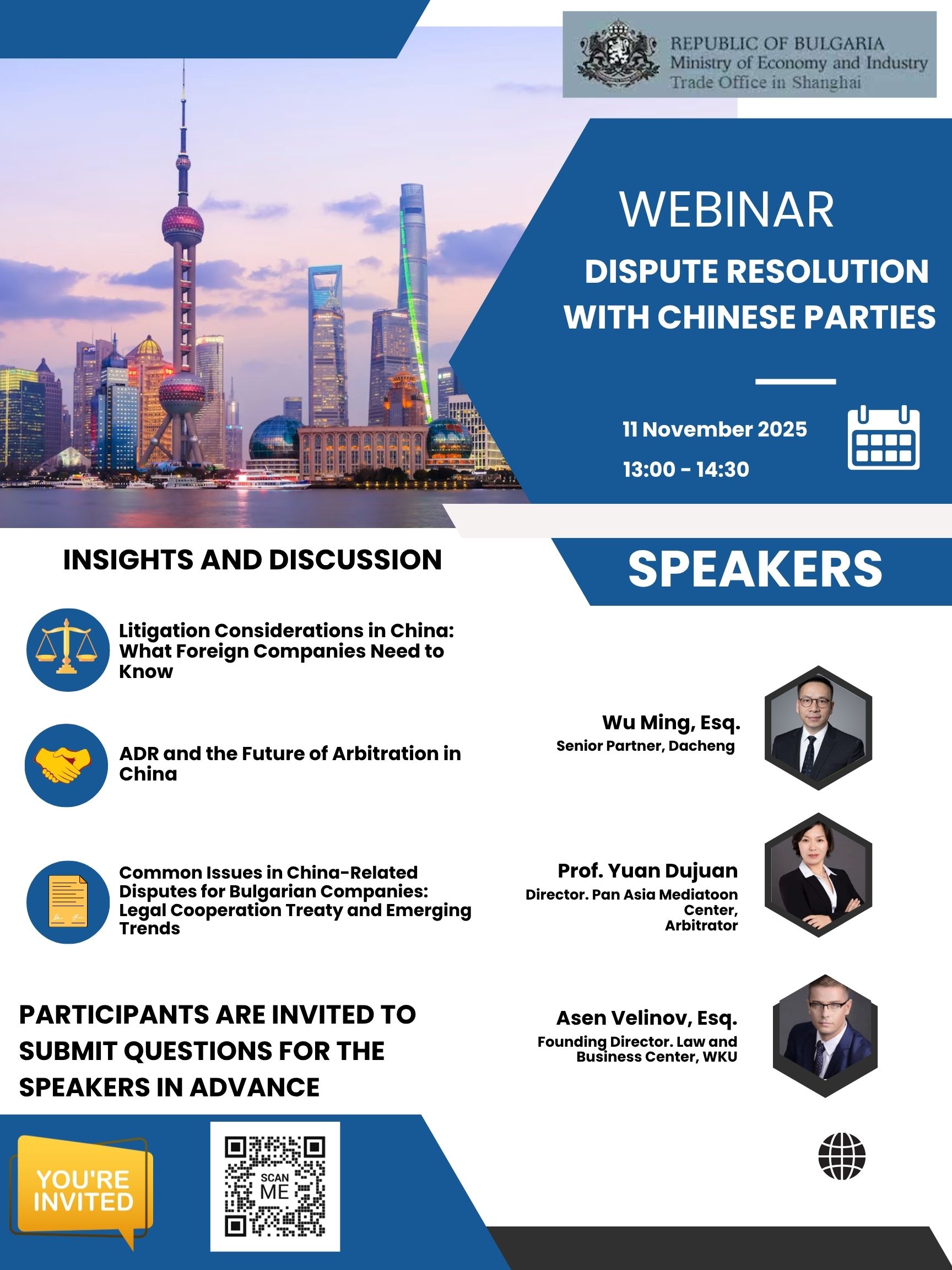 СТИВ – Шанхай информира за пореден уебинар №6 за българския бизнес "Стратегии за успешно разрешаване на спорове с китайски контрагенти" на 11 ноември 2025 г. от 13 часа.